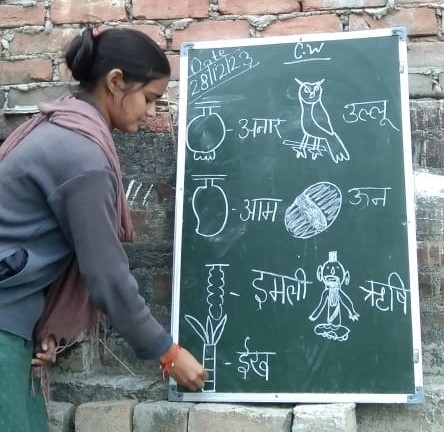 Ms. Meena Yadav initiated the Q.C. Shiksha Kendra at Bijdi in April 2021. Ms Meena says, "My elder sister told us about the QC Shiksha Kendra. She used to visit Imamganj, where she saw Ram Sevak Ji teaching children. When she asked Ram Sevak Ji about it, he explained about the QC Shiksha Kendra to her. After my sister shared this with us, I learned about the QC Shiksha Kendra. Meena continues, "I was inspired to start the QC Shiksha Kendra by my elder sister. When she told me about it, I thought that I too, could help the children in the village. I wanted to assist children who cannot attend school or whose parents are unable to send them. I hoped to share with them whatever knowledge I have."